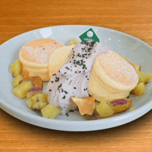 和歌山県かつらぎ町の阪中農園様が大切に育てた梨を贅沢に1玉つかっております。ベーシックパンケーキにスライスした梨をのせた見た目にも可愛いパンケーキです。