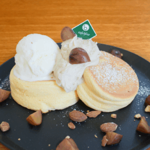 きなこレアチーズにアーモンドクロッカンを添えたこのパンケーキに黒蜜をかけると、豊かな甘さと香ばしさが絶妙に絡み合い、和の趣き深い味わいが楽しめます!当店スタッフいち押しです!