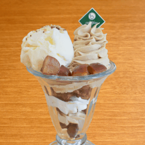ココアパンケーキに紅はるかクリーム、和栗の渋皮煮、バニラアイスを重ねています!まるでモンブランのような贅沢なパフェです!