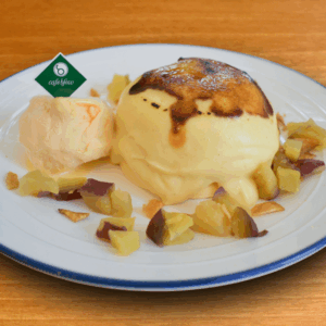 ふわふわ生地に紅はるかとあんこクリームをのせ、黒ごまを合わせています!和の風味を楽しめる贅沢なスイーツです!溶かしバターをかけてお召し上がりください!